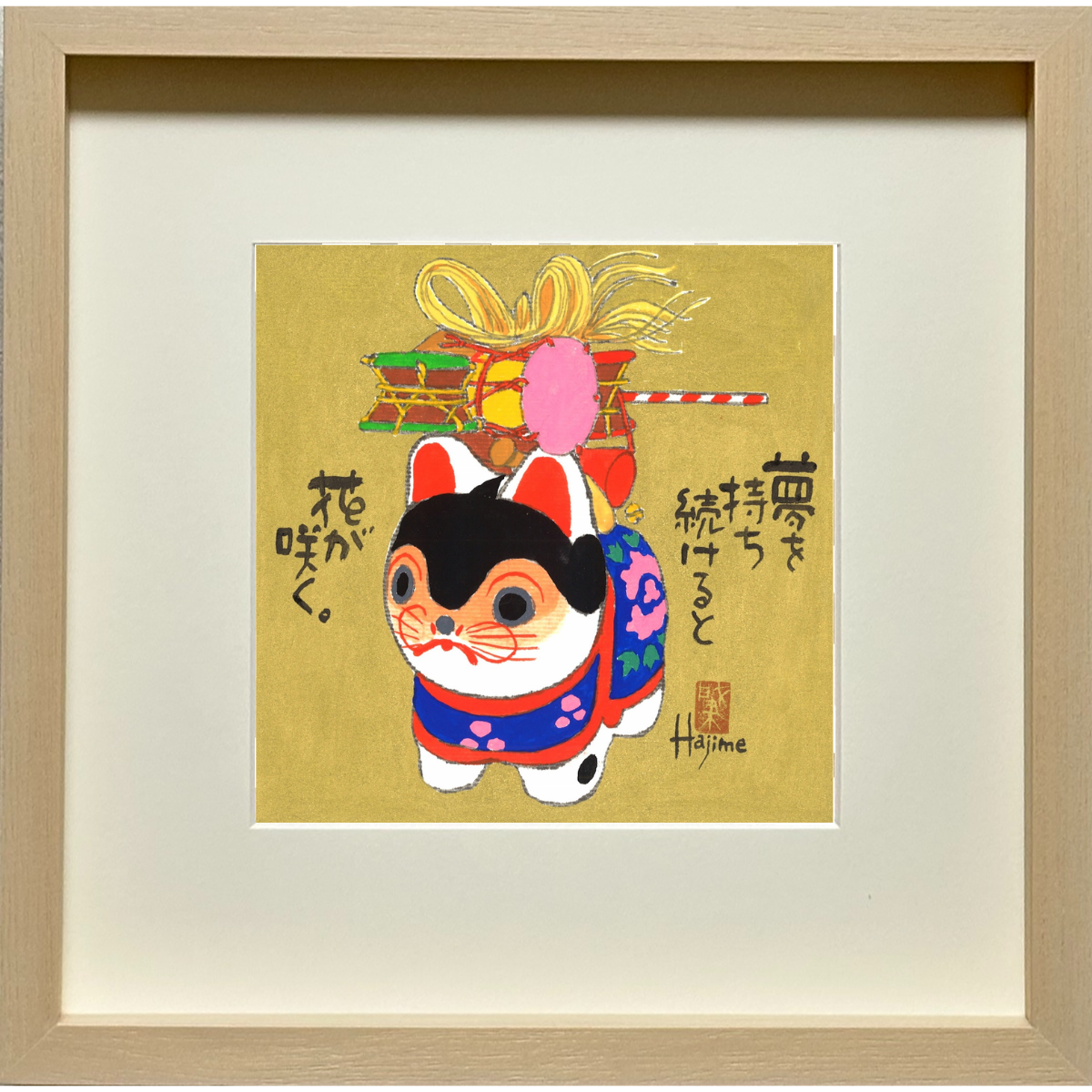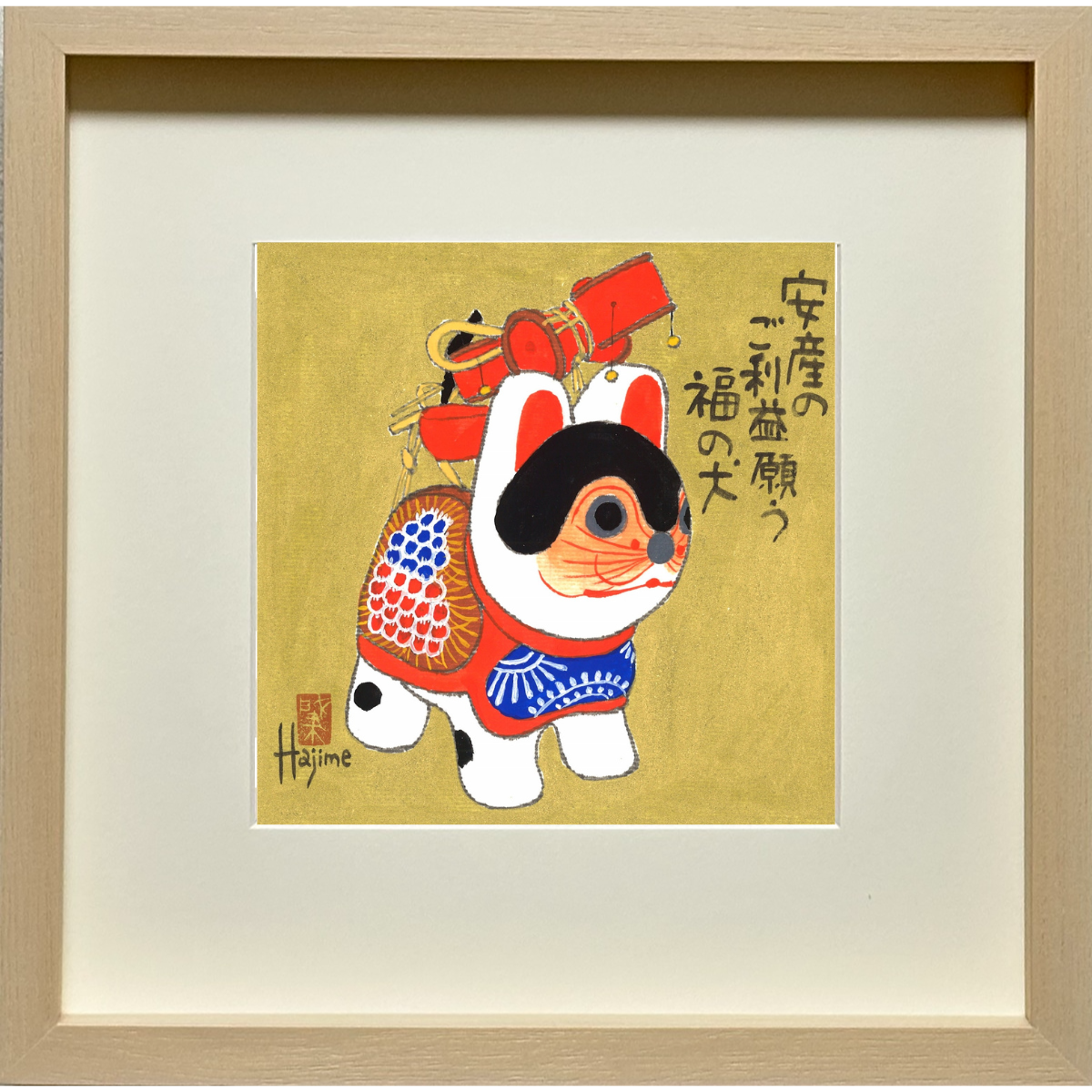 犬張り子「でんでん太鼓ー花が咲く」手描き作品 額付 絵画 水墨画